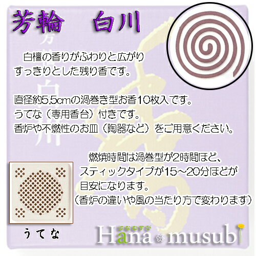 備考欄 ⇒「白川スティックタイプ20本入」はコチラ【お香】芳輪 白川 渦巻き型お香 松栄堂 料亭・旅館でも使われている伝統的な香りを気軽に楽しめます